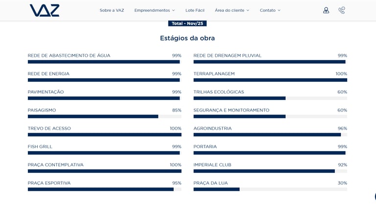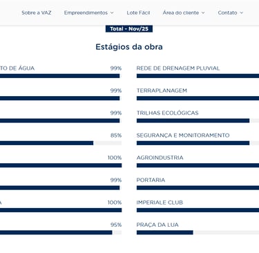 Acesso, portaria, ruas, infraestrutura, área da fazenda com pastos para o gado, preparação do terreno e semeadura de hortifrútis, ruas, galinheiros, infraestrutura, piscina de borda infinita do Imperiale club, Deque e lago de criação de tilápias, além de área reservada para prática de esportes.