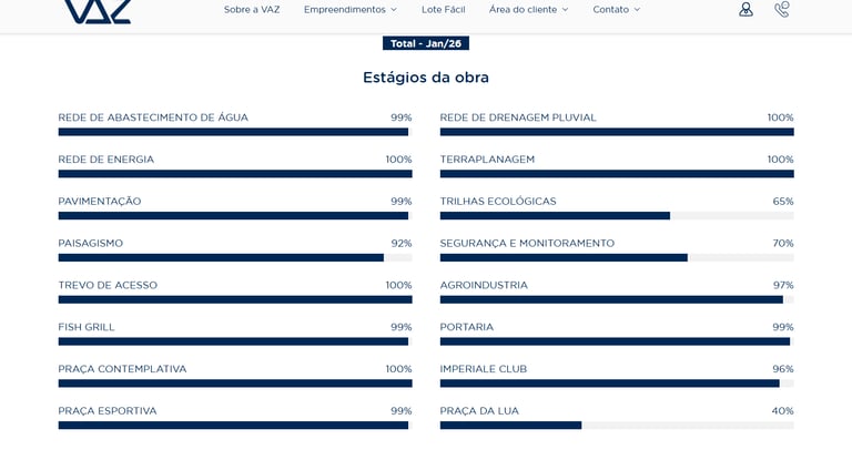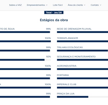 Acesso, portaria, ruas, infraestrutura, área da fazenda com pastos para o gado, preparação do terreno e semeadura de hortifrútis, ruas, galinheiros, infraestrutura, piscina de borda infinita do Imperiale club, Deque e lago de criação de tilápias, além de área reservada para prática de esportes.